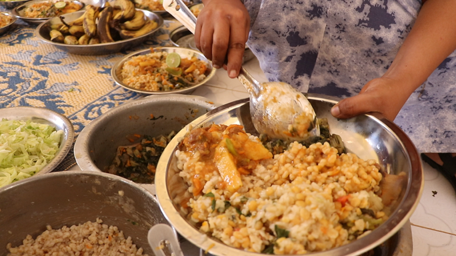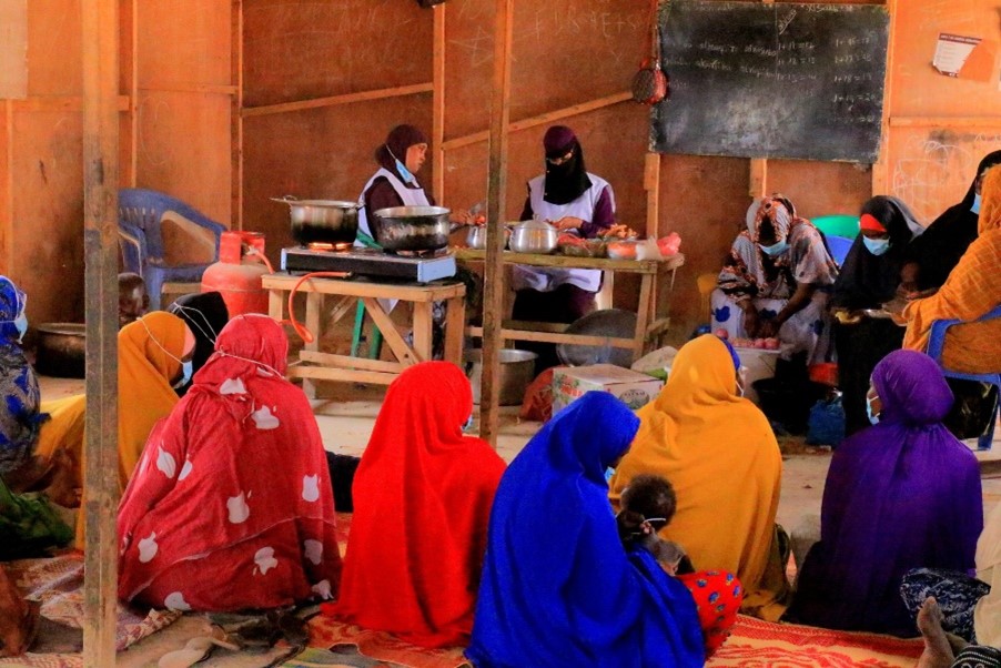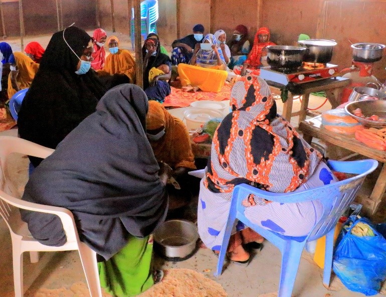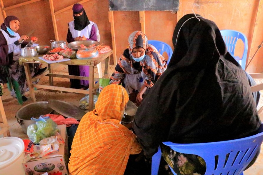 ISDP with support of UNICEF Food demonstration session in action, where mothers and IYCF counselors prepared and cut locally available foods to create nutritious meals. The activity promoted healthy cooking practices and encouraged the use of diverse, locally sourced ingredients to improve family nutrition.